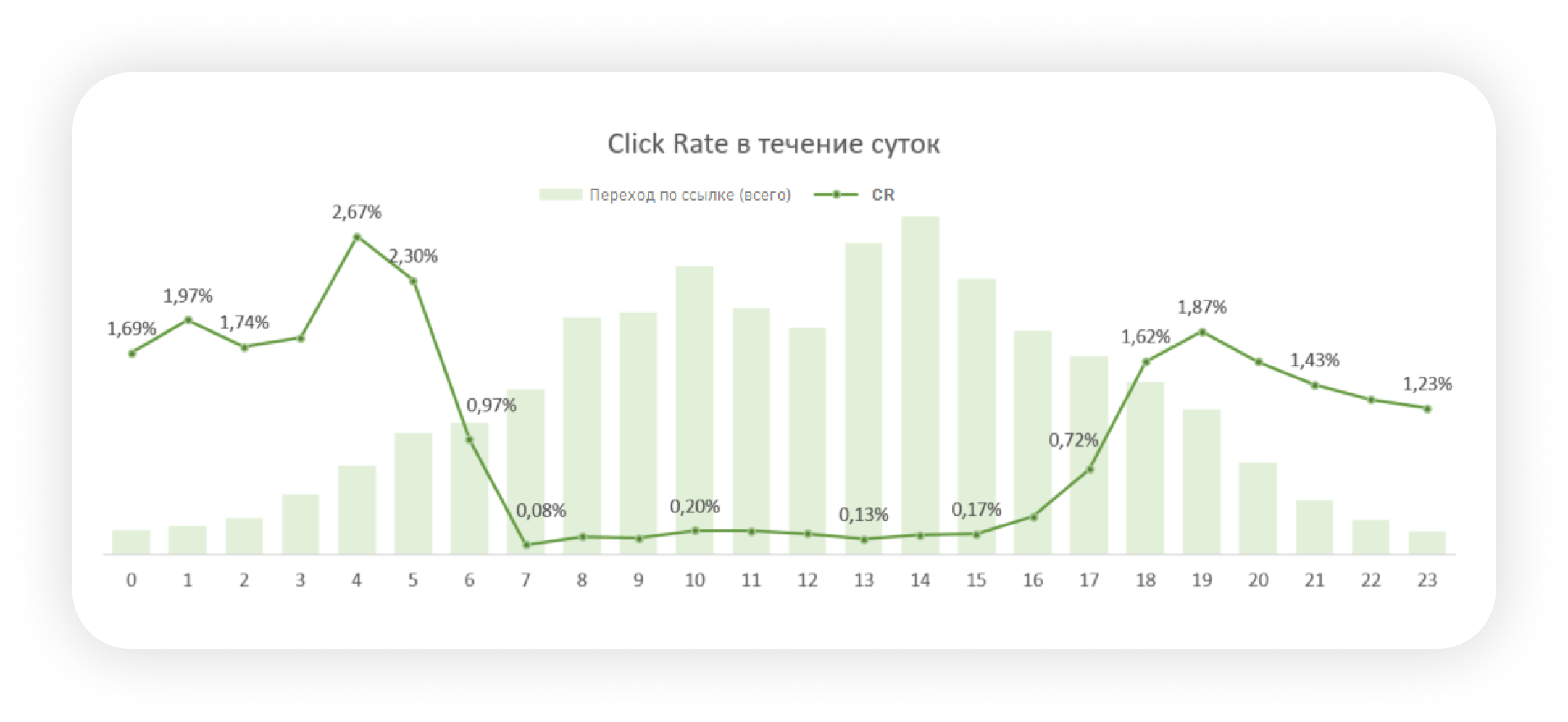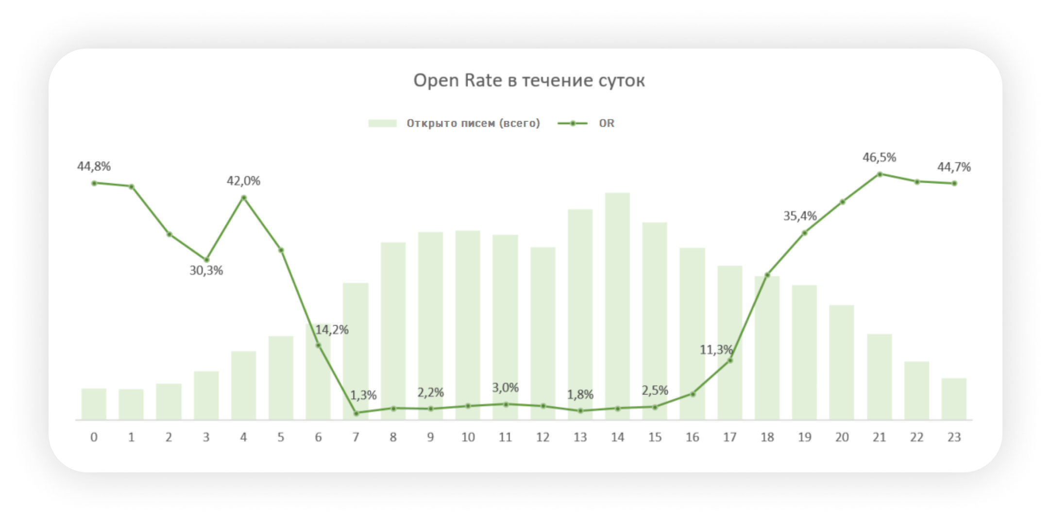 Это говорит о том, что письма удобно читать днем — но действия чаще совершаются вечером, когда у человека больше личного времени. Такой разрыв между Open Rate и Click Rate открывает окно для гибкой стратегии: информационные рассылки лучше планировать на середину дня, а письма с CTA(призыв к действию) и акциями — ближе к вечеру.