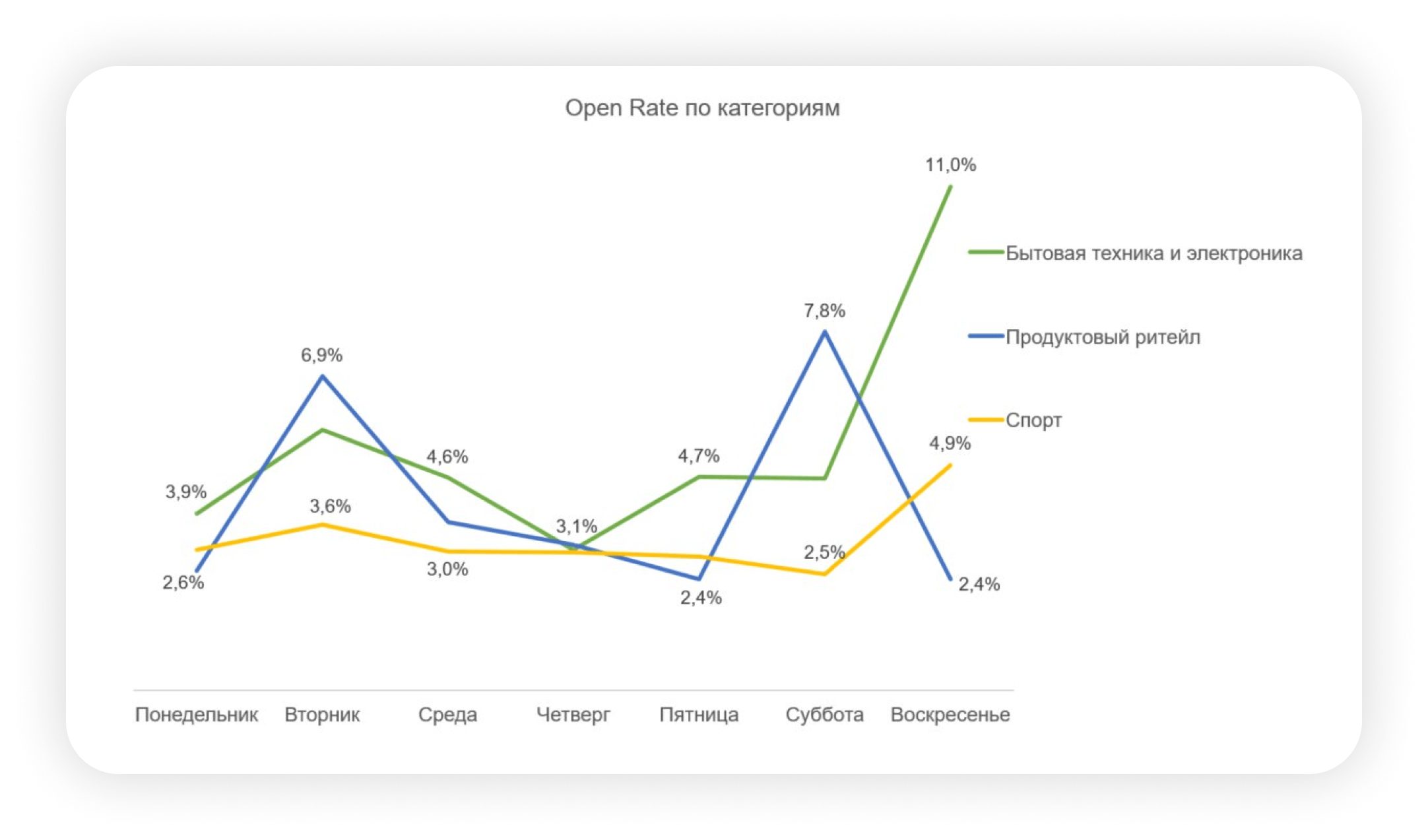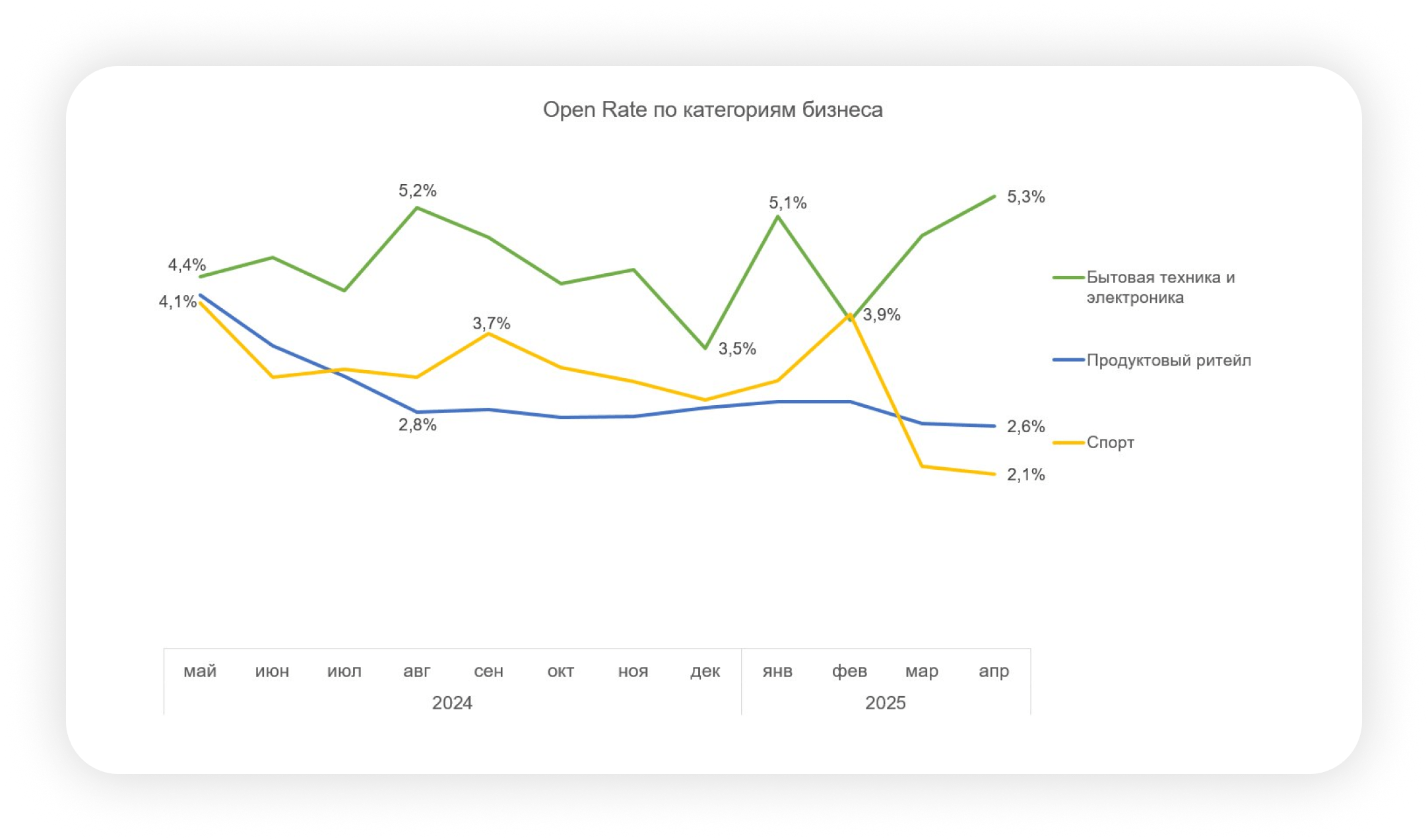 Продуктовый ритейл и категория «Бытовая техника и электроника» демонстрируют разные уровни вовлеченности потребителей в email-рассылках, что обусловлено различиями в характере предложений и потребительских интересах.