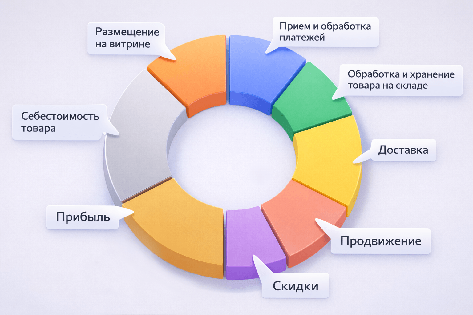 Полный состав расходов продавца: комиссия за продажу, логистика до покупателя, последняя миля, хранение (если работаете по FBO), возвраты и невыкупы, внутренняя реклама, промо-акции и операционка на ведение канала.