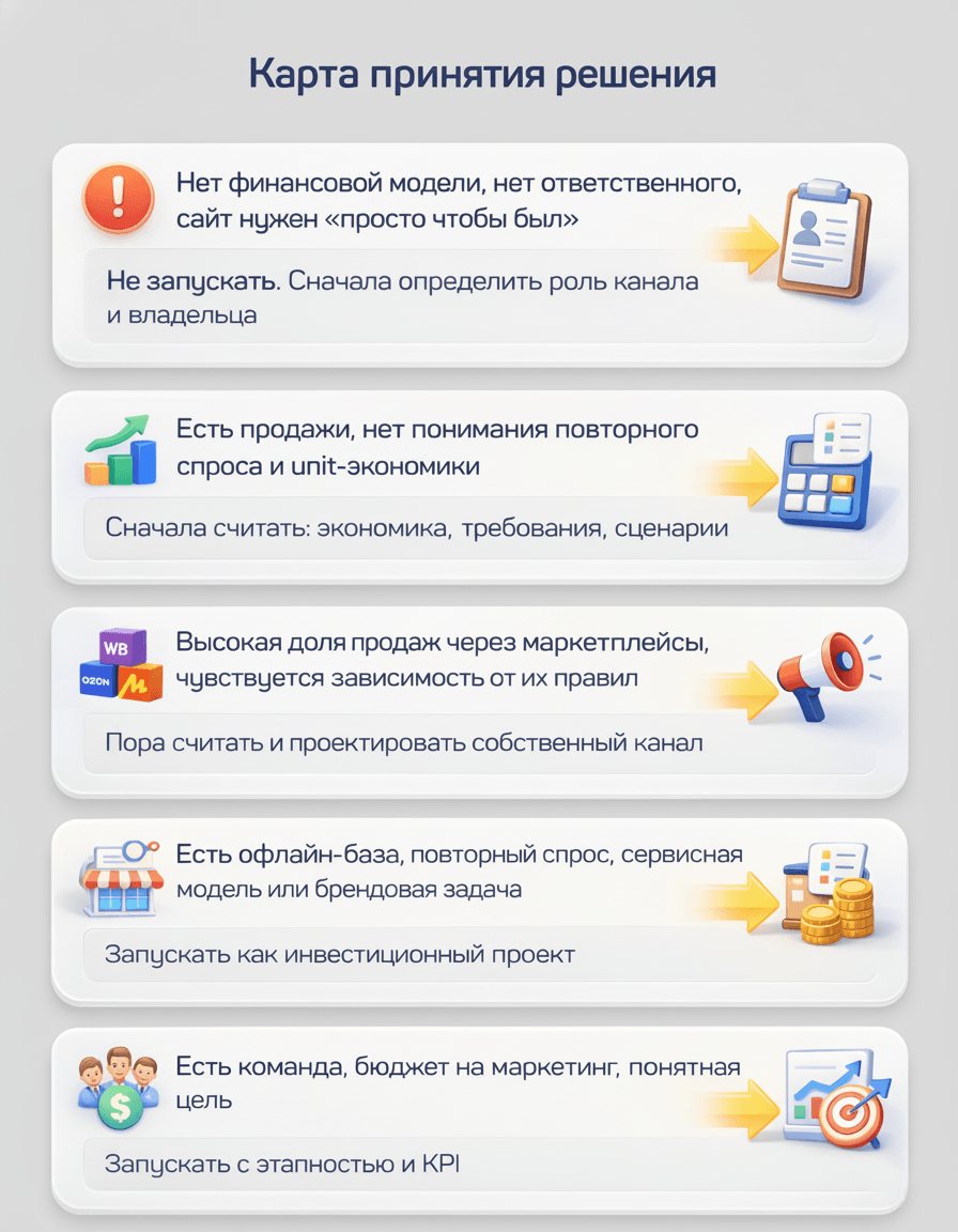 Интернет-магазин не перебьёт маркетплейс по обороту. Его роль другая: собрать свою базу, управлять повторными покупками, выстраивать прямую коммуникацию и развивать сценарии, которые на сторонней платформе недоступны.