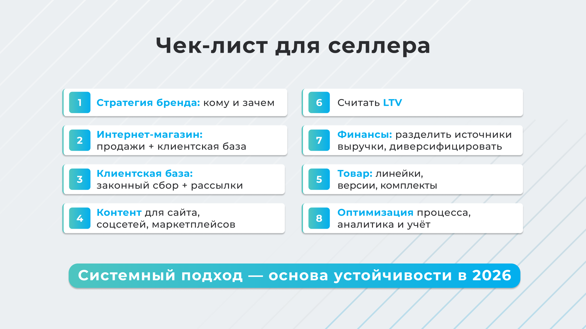 2026 год станет непростым для селлеров: вырастают налоги, ужесточаются требования к сертификации товаров и контенту, конкуренция зашкаливает, рост тарифов не прогнозируем. Да, сложно. Но выживают те, кто приспосабливается, а чтобы приспособиться необходимо мыслить стратегически и вовремя принимать меры. Мы делимся своим видением ситуации и предлагаем вместе подготовиться к новым реалиям.