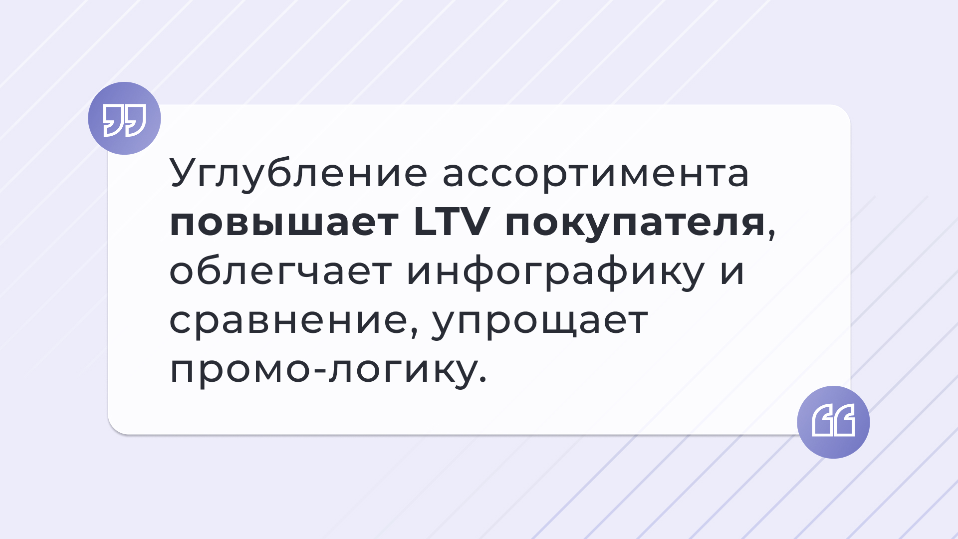 Углубление ассортимента повышает LTV покупателя, облегчает инфографику и сравнение, упрощает промо-логику.
