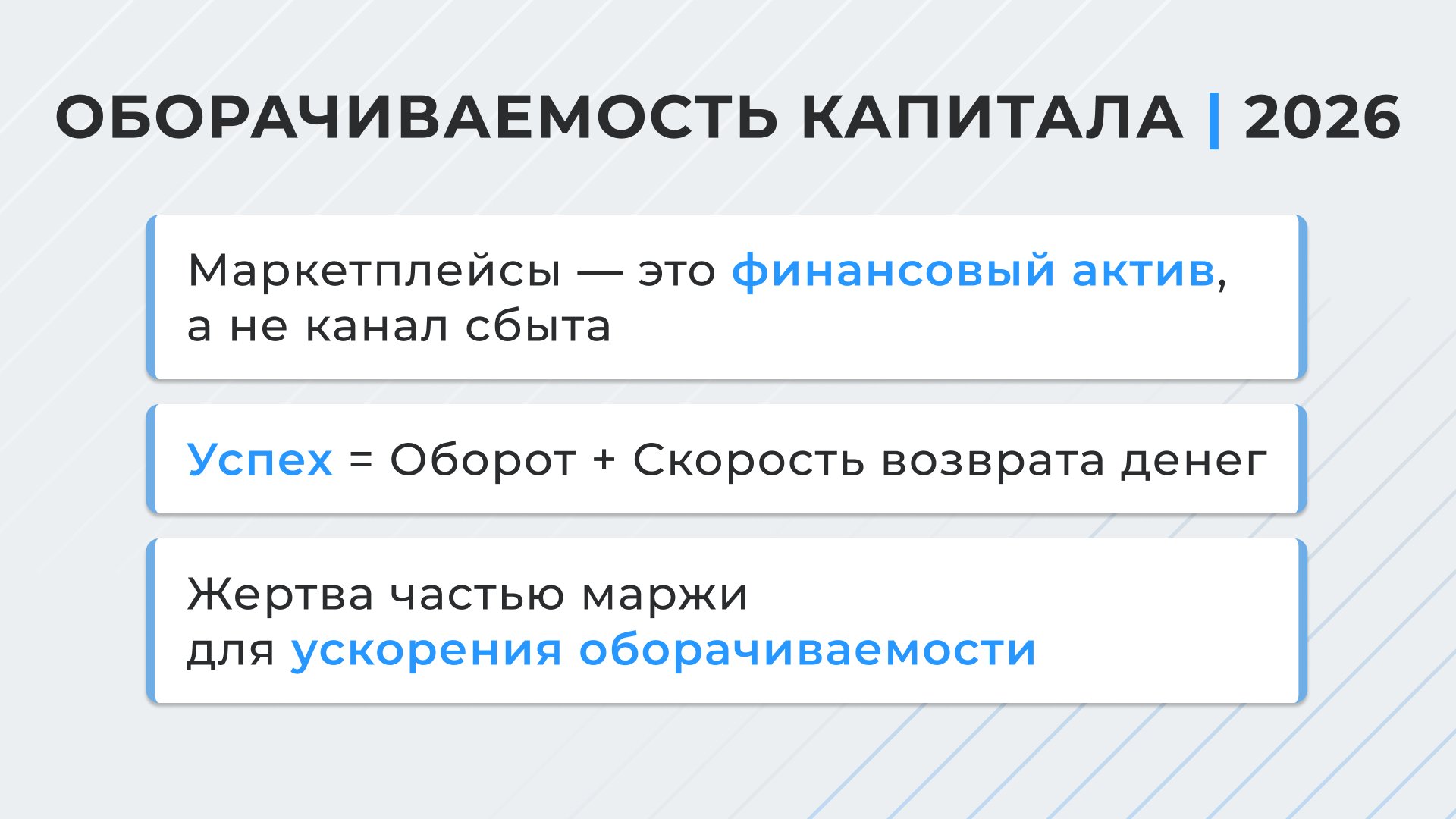 На фоне роста НДС и налоговой нагрузки, удорожания логистики, хранения и рекламы, и ужесточения требований к контенту и комплаенсу, ключевым KPI (показатели эффективности) становится не GMV (объем продаж) и даже не маржа, а скорость возврата вложенного капитала (Capital Turnover / Cash Conversion Cycle).
