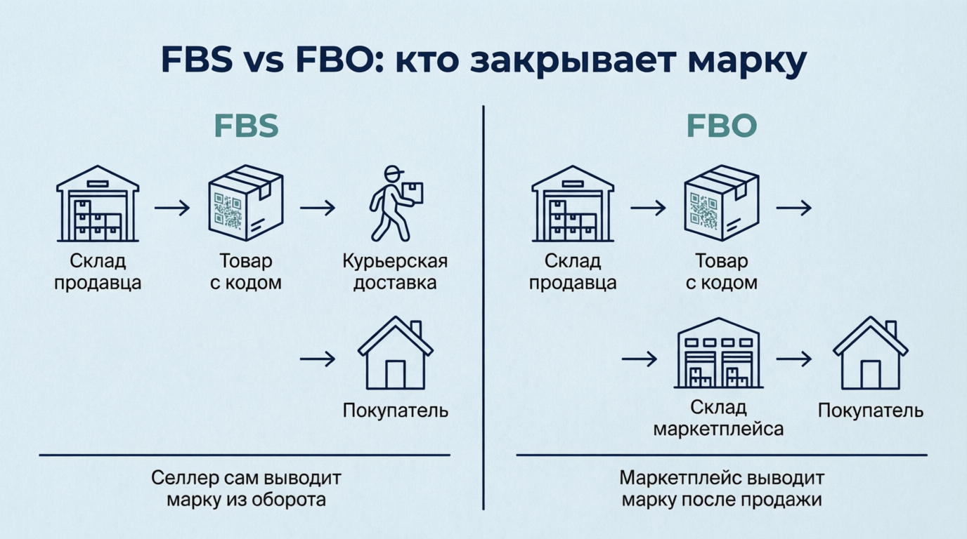 Ozon. По FBS коды маркировки передаются в документах только по корпоративным сделкам — когда покупатель юридическое лицо. Розничные продажи физлицам этого не требуют. Для FBO-поставок — три сценария: загрузить УПД до отправки, при обнаружении маркируемых позиций в заявке или по итогам приемки для сверки (справка Ozon).