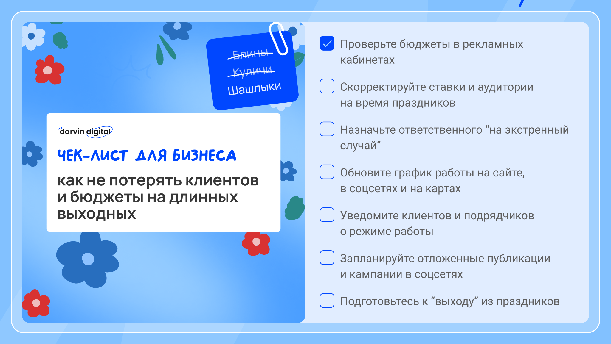 Большинство ошибок, которые происходят на майских, — результат не обстоятельств, а отсутствия подготовки. Праздники могут пройти спокойно, если заранее закрыть все слабые места в процессах. Проверить бюджеты, настроить автоответчики, передать доступы, предупредить клиентов и подрядчиков — задачи, которые занимают пару часов, и, главное, сохраняют доверие клиентов, эффективность рекламы и устойчивость бизнеса.