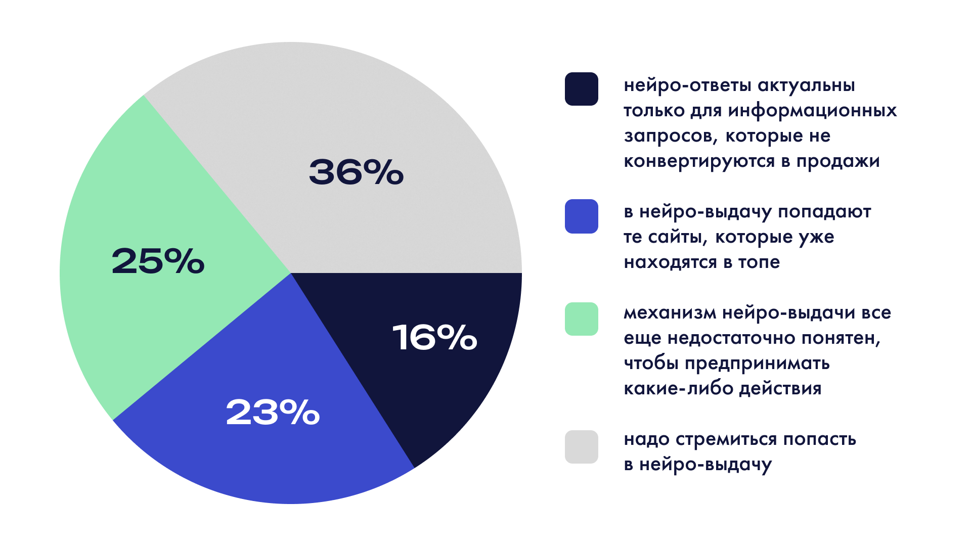 В качестве причин, почему маркетологи не видят необходимости стремиться в нейро-выдачу, называют бессмысленность предпринимаемых действий: 16% считают, что нейро-ответы актуальны только для информационных запросов, которые не конвертируются в продажи, 23% утверждают, что в нейро-выдачу попадают те сайты, которые уже находятся в топе, а 25% полагают, что механизм нейро-выдачи все еще недостаточно понятен, чтобы предпринимать какие-либо действия.