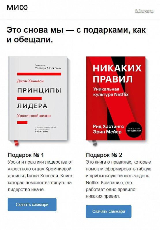 Если человек подписался на рассылку в обмен на что-то, например, на бонусные 500 рублей, бесплатную доставку при первой покупке, экспресс-аудит, то важно в одном из первых писем повторить условия получения. А в идеале — сразу отдать обещанное, если для этого пользователю больше ничего не нужно делать. Так, издательство «МИФ» дарит краткие пересказы двух книг в ответ на подписку