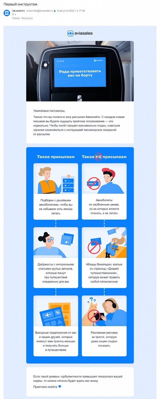 В качестве хорошего примера могу привести письма компании «Авиасейлз». Они сразу погружают подписчика в атмосферу путешествия и формируют у него правильные ожидания от подписки: рассказывают, о чём будут письма, как часто они будут приходить и какую пользу несут: