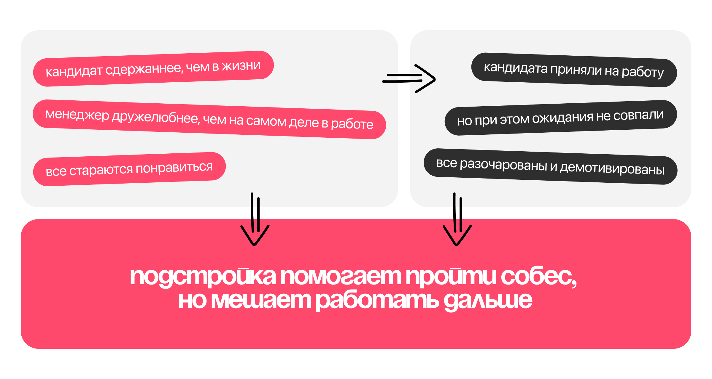 Именно поэтому в попытке «попасть в настроение собеседника» чаще всего и возникает ошибка. Когда кандидат старается казаться более сдержанным, чем он есть, или, наоборот, менеджер надевает маску чрезмерной дружелюбности, то собеседование превращается в спектакль. В моменте эти приёмы могут сработать, но после выхода на работу маски неизбежно слетят — и тогда окажется, что ожидания не совпали.