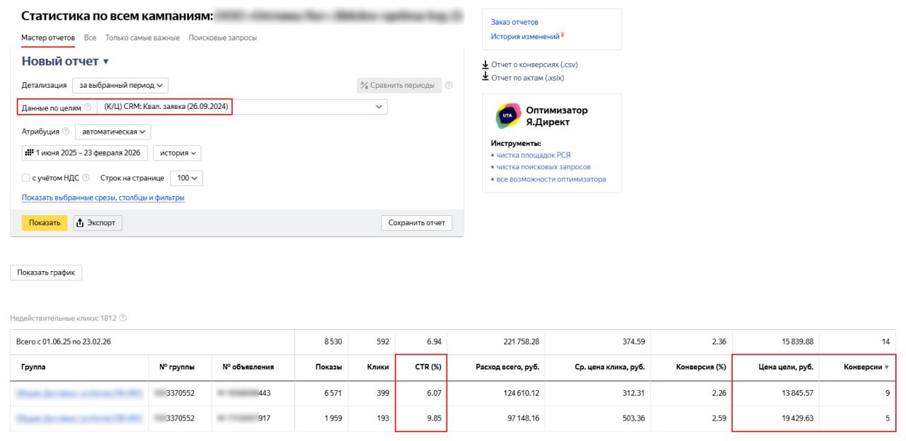 Для чистоты примера приведены данные по одной группе объявлений, чтобы сравнение было корректным и не размывалось общей статистикой аккаунта.