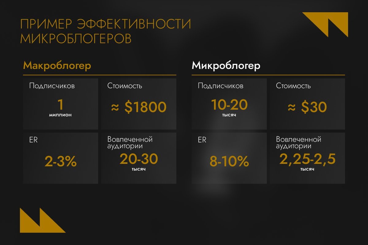 При бюджете в $1300 можно работать с 43 микроблогерами и охватить 100 000 вовлеченной аудитории, в то время как с одним макроблогером охват составит всего 30 000.