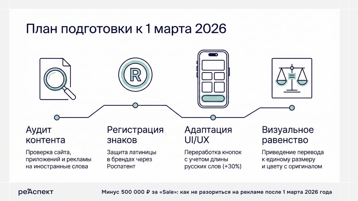 Провести аудит контента — проверить все сайты, приложения, рекламные материалы, вывески и меню на наличие иностранных слов без перевода.