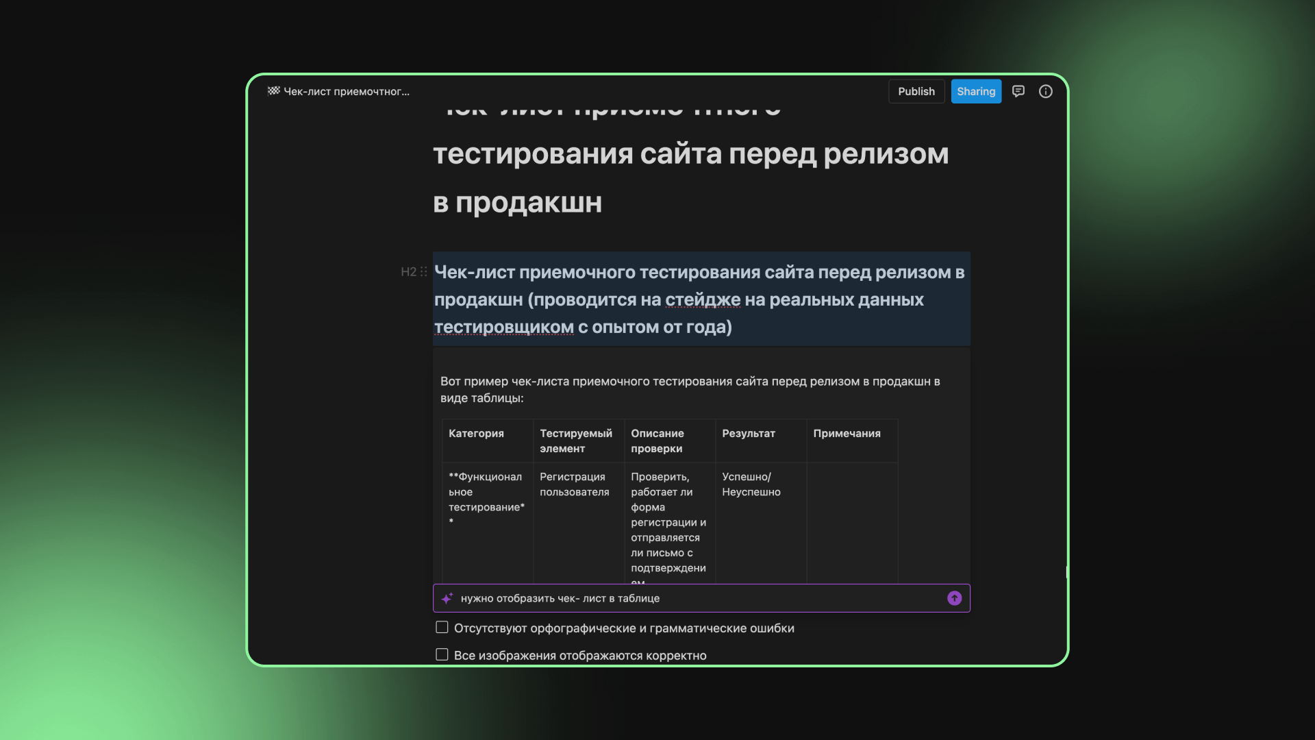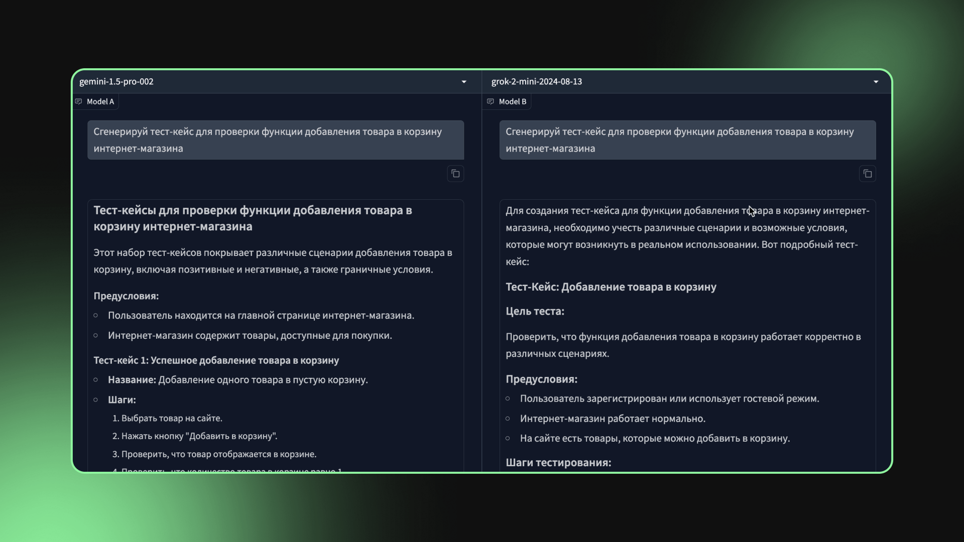 Другая задача, с которой справляется ИИ, — написание тест-кейсов. Раньше это занимало много времени. Теперь мы описываем функцию в запросе, и нейросеть сразу предлагает основу: шаги проверки и ожидаемые результаты.
