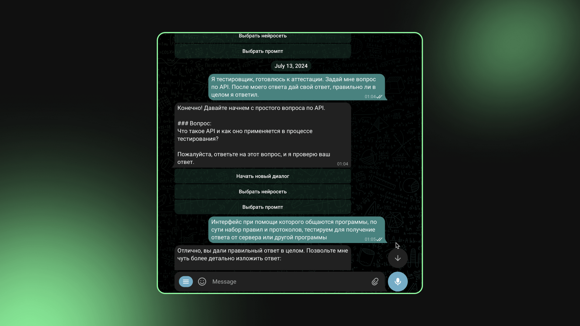 Инженеры давали ответы, а ИИ анализировал их на полноту, указывал на ошибки и предлагал рекомендации. Например, добавить проверку статус-кодов в API-тестах или уточнить критерии приоритизации багов.