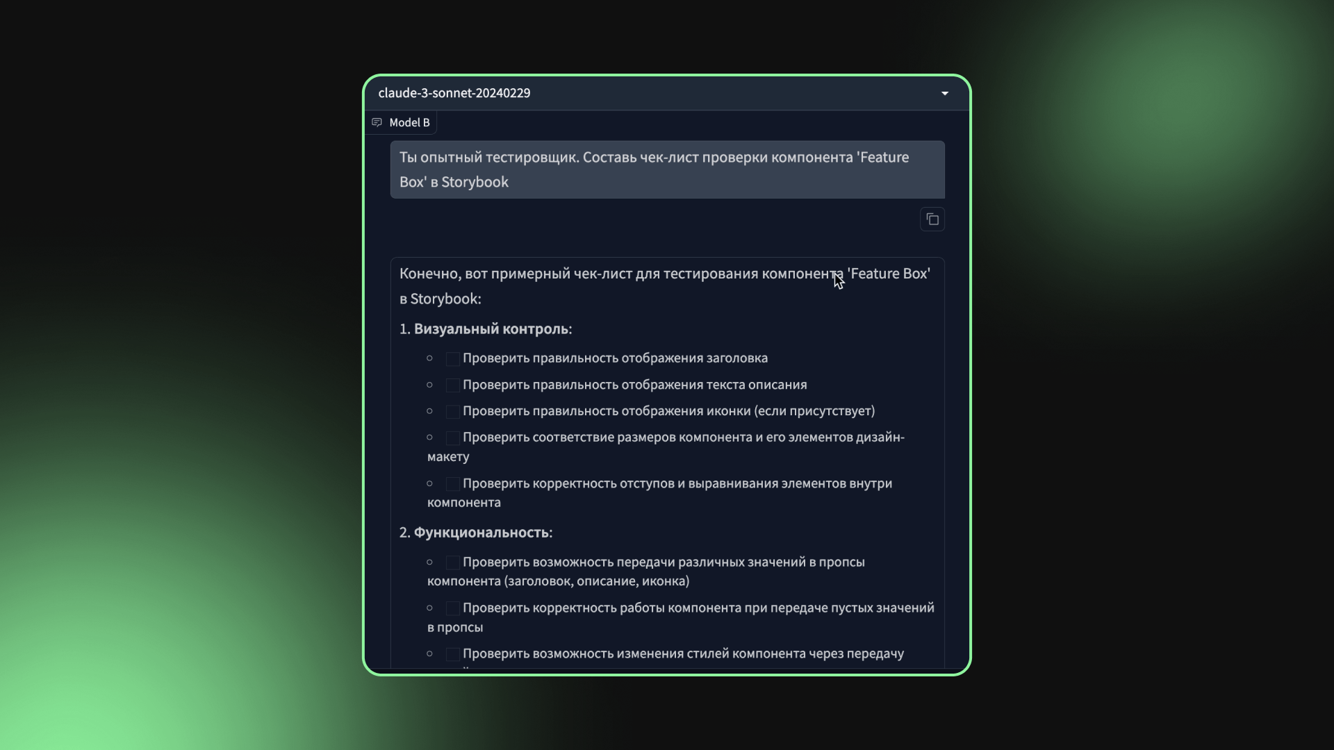 Временные затраты специалиста и ИИ мы сравним дальше в статье. А здесь покажем результат. Чтобы получить чек-лист по вёрстке, мы задаём точный запрос
