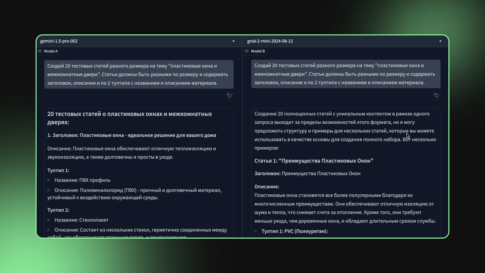 ИИ генерирует реалистичные тексты с заголовками и описаниями. Раньше на подготовку тестовых данных уходил час, а то и два. С ИИ — пара минут и можно тестировать.