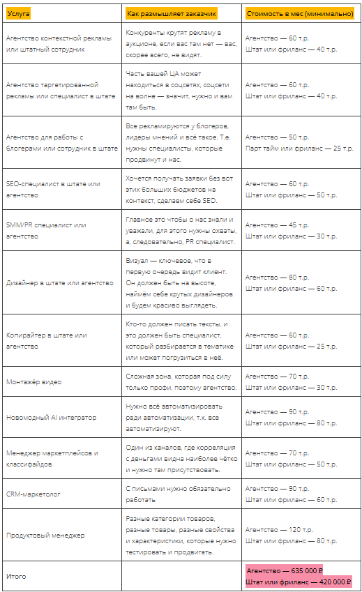 Веду к тому, что после сборки аналитики и приоритизации процессов на самом деле выходит так, что вам достаточно 1-2 маркетологов, которые при достаточном уровне качества смогут вести ваш маркетинг самостоятельно.