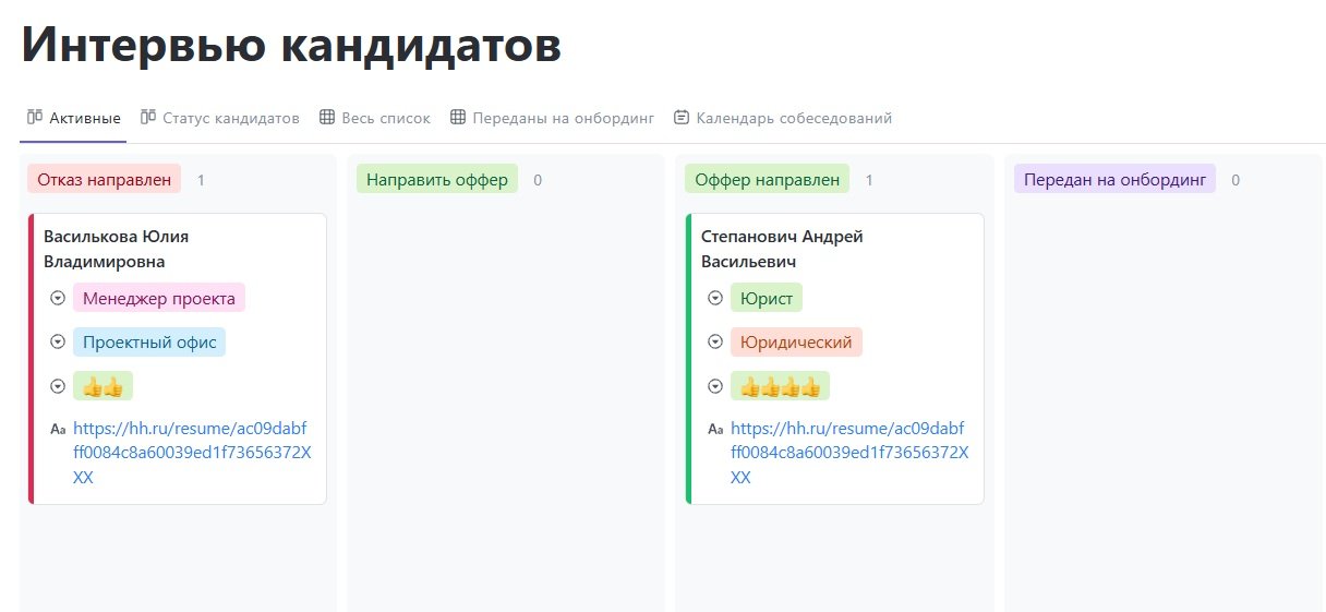 Далее работа с протоколом продолжается: сотрудник переносит его в рабочее пространство на платформе. На основании записи ставит задачи и назначает дедлайны. Например, кандидат прошел первый этап отбора, и HR создает задачу на следующее собеседование с руководителем отдела.