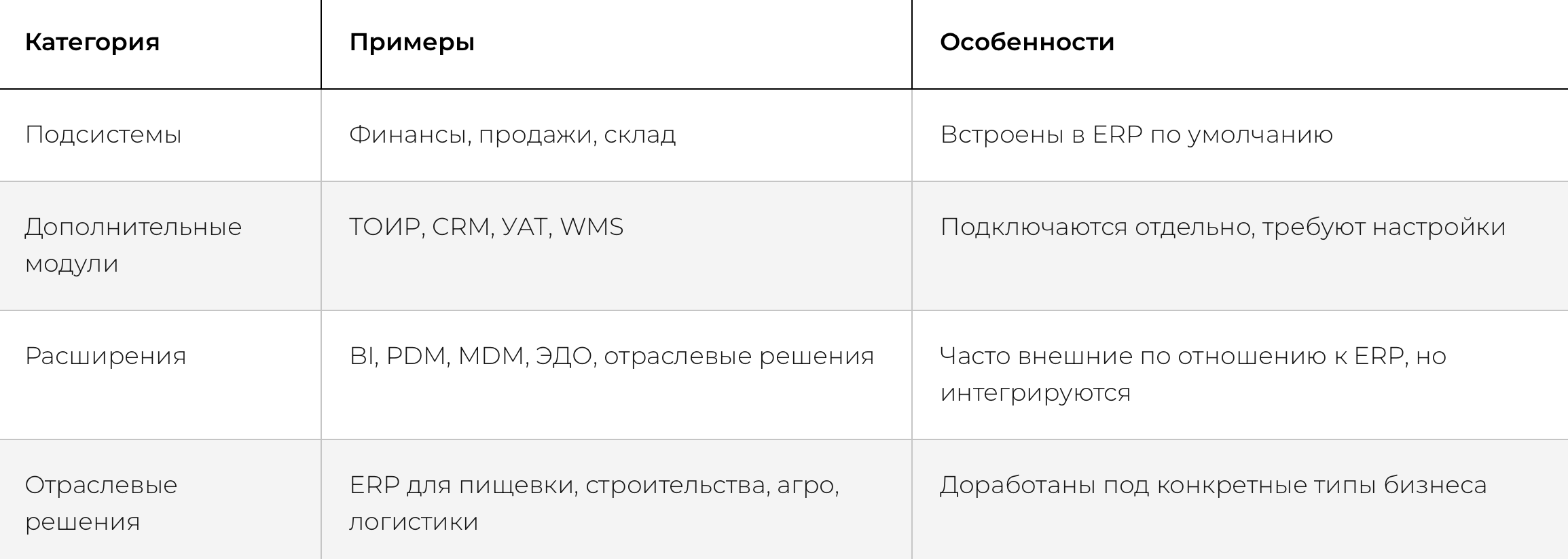 Модуль (или подсистема) — это функциональный блок с конкретной задачей. Например, финансы, склад или CRM. Есть три категории: