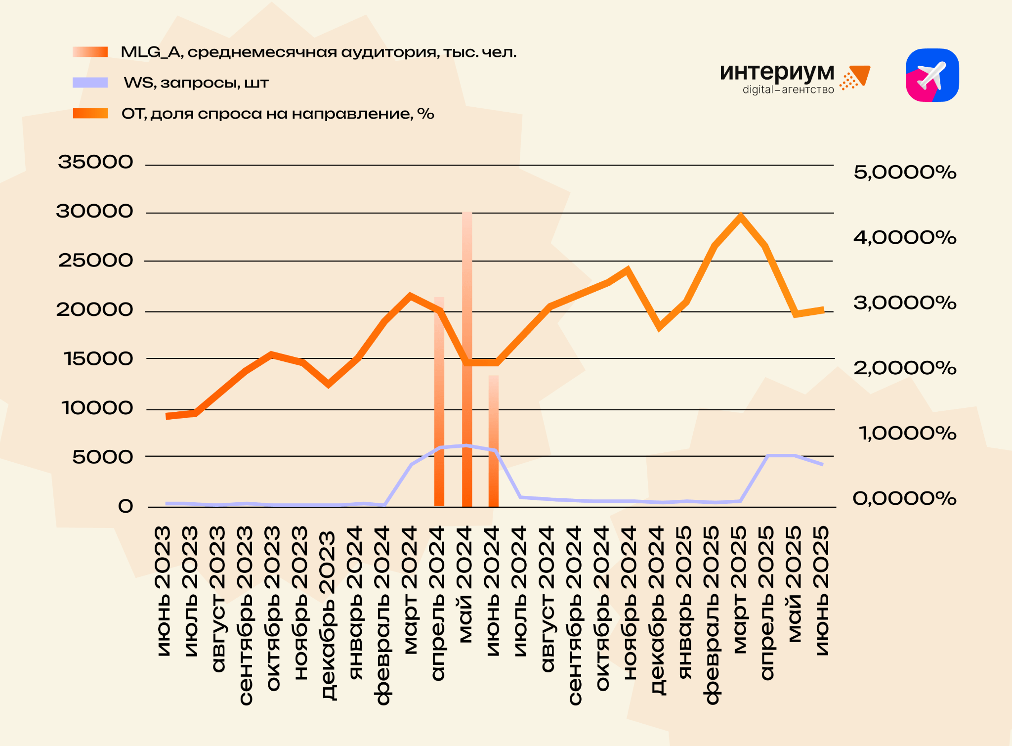 - доля спроса на направление, по данным Ozon Travel, достигает пика в январе-2025 — 11,52% (в среднем ранее — 3–9%).