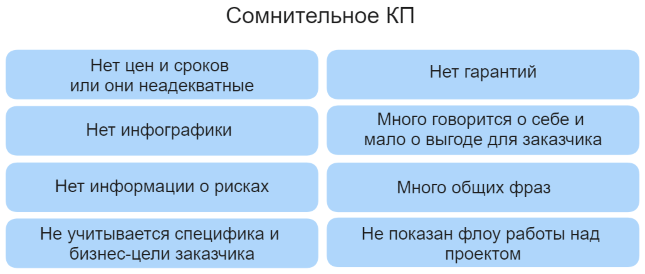 Как вы поняли, в хорошем предложении на разработку всё ровно наоборот. В нём есть структура, которая ведёт своего потенциального клиента от точки «Проблема» в точку «Решение». В нём есть подробное описание проблемы, которую предстоит решить, её предпосылки и влияние на бизнес, перечень инструментов, как эта проблема будет решаться.
