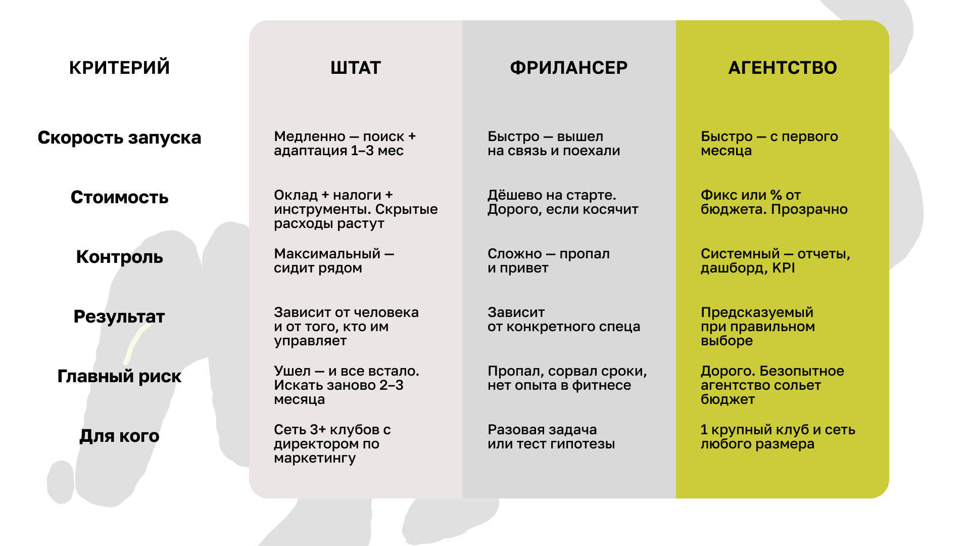Есть вещи, которые фитнес-клуб не должен отдавать наружу: продукт, работа с текущими клиентами, репутация. А вот лидогенерацию, рекламу, аналитику, лендинги — можно и нужно. И еще: если вы не готовы вникать в отчеты, давать обратную связь и участвовать в процессе, не спасет никто. Маркетинг в фитнесе без участия собственника не работает! Не получится все страдания скинуть на кого-то и ожидать исключительно поступлений денег на расчетный счет.