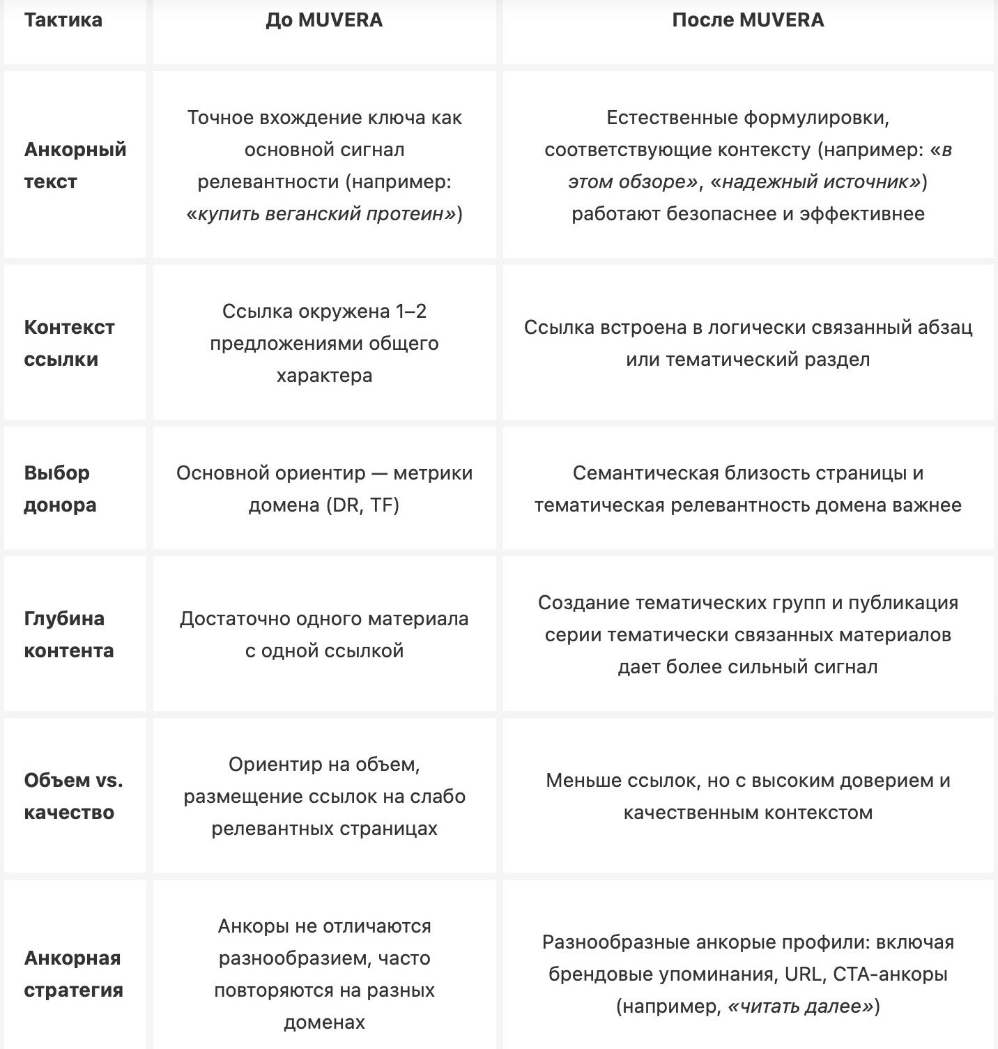 Несмотря на масштабные изменения в алгоритме, ссылки остаются важным фактором SEO, но теперь Google оценивает их не только как метрику, но и как сигнал качества и контекста. MUVERA делает акцент на:
