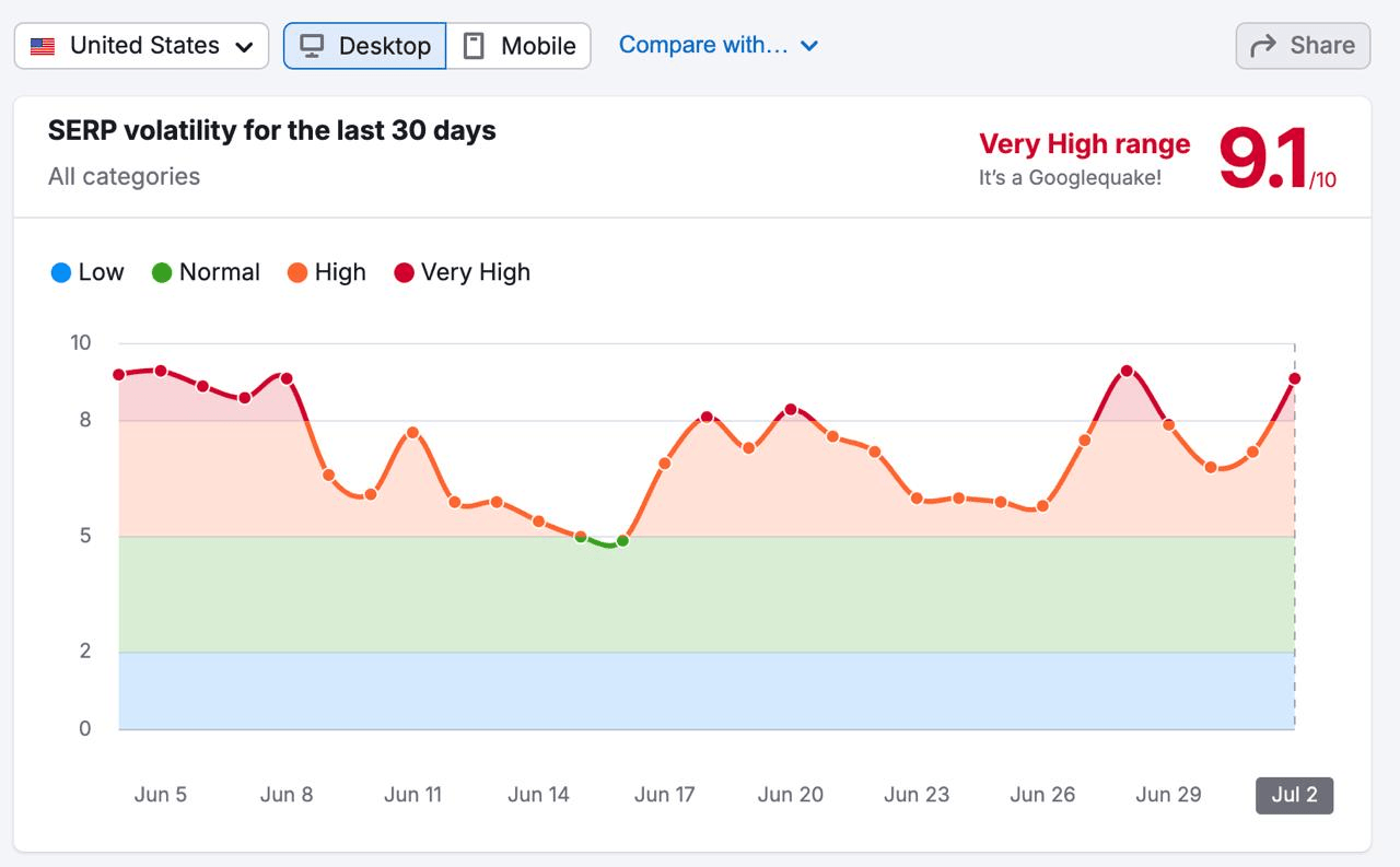 Результаты не заставили себя ждать: аналитические сервисы зафиксировали всплеск нестабильности в выдаче по самым разным тематикам. Например, данные Semrush Sensor по США показали резкие колебания рейтингов, наглядно демонстрируя, насколько глубоко MUVERA меняет способ оценки контента и ссылочной структуры сайтов.