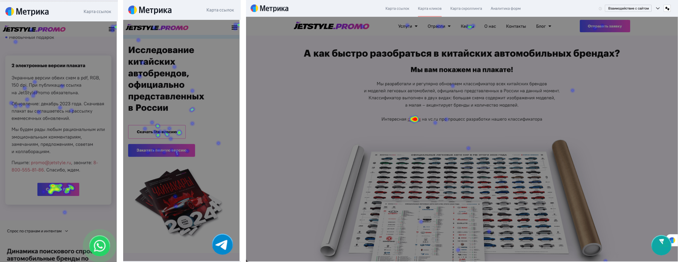 Также для анализа поведения мы используем инструменты Метрики: карты кликов, ссылок и тепловые карты. Последняя работает по аналогии в тепловизором — чем больше пользователей просматривают область экрана, тем она краснее. Оценивать стоит самые часто посещаемые страницы.