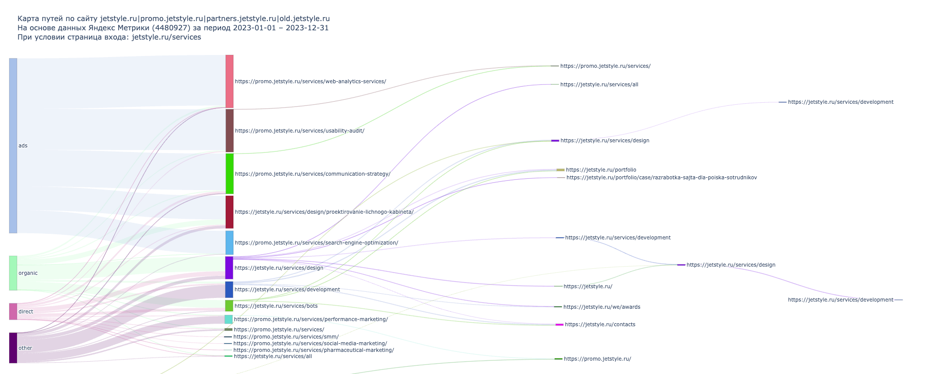 Обращаемся к картам путей — берем какую-то страницу или группу страниц и смотрим, откуда приходят пользователи: реклама, органика, прямой или другой трафик, и куда они с них уходят. Нам интересны как поведение, так и конверсии в различных срезах.