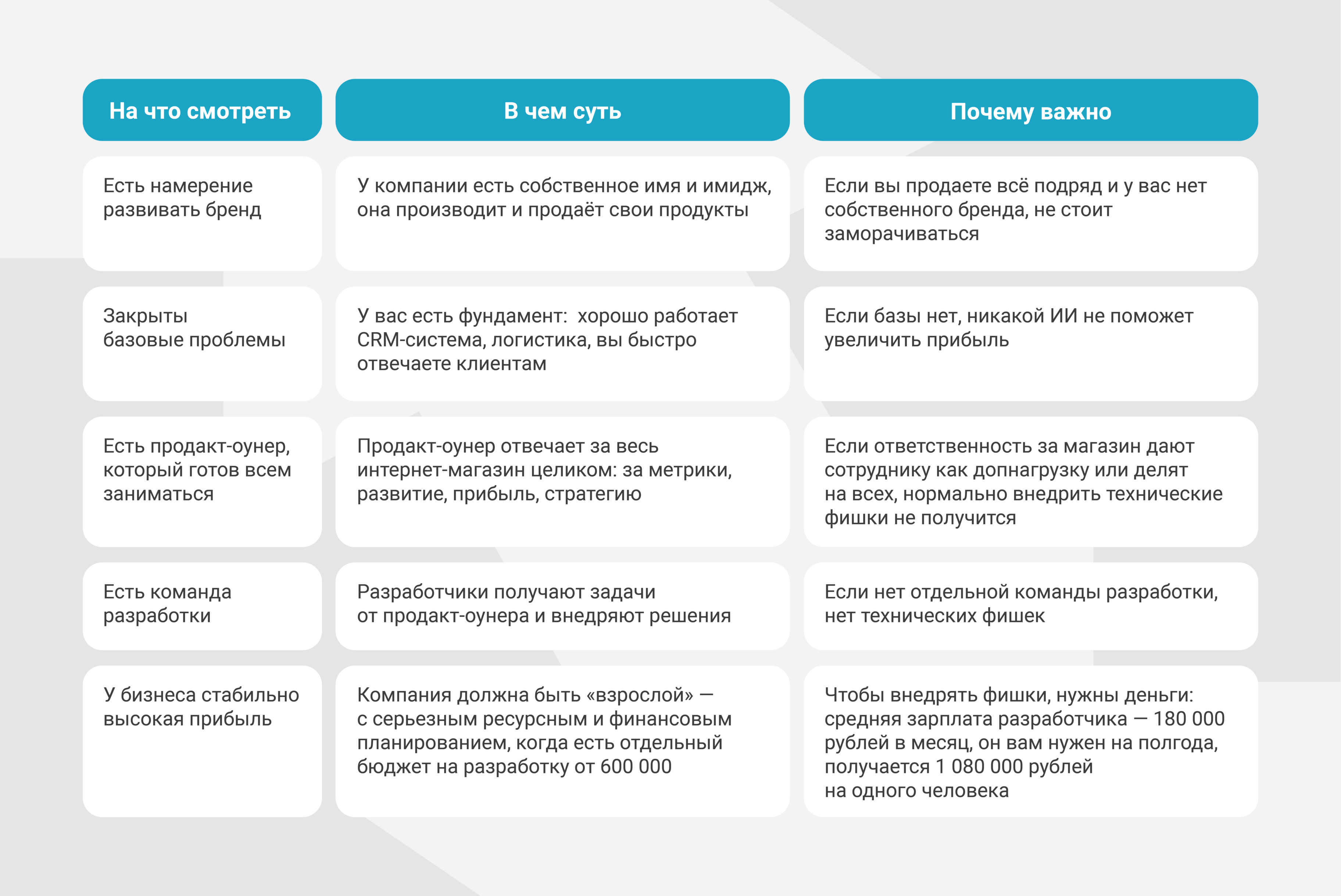 Технические фишки — история для уже состоявшихся бизнесов и взрослого ecom, потому что иначе компания просто не потянет изменения и станет только хуже. И собственнику это важно понимать перед тем, как начать работы.