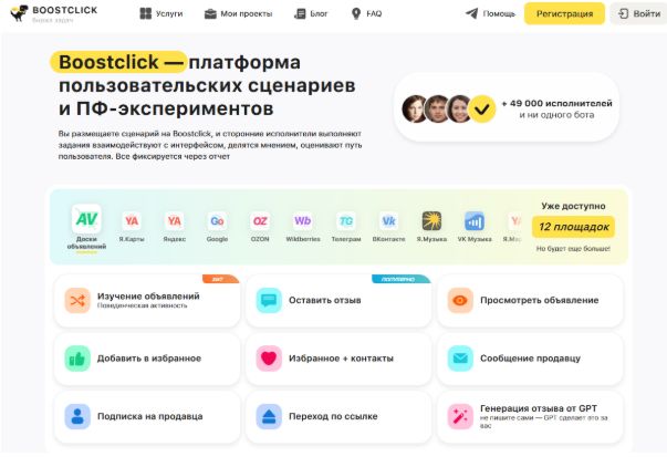 Boostclick сочетает автоматические методы с привлечением реальных пользователей через биржу заданий. Сервис специализируется на естественной имитации поведения для соцсетей, маркетплейсов и поисковых систем.
