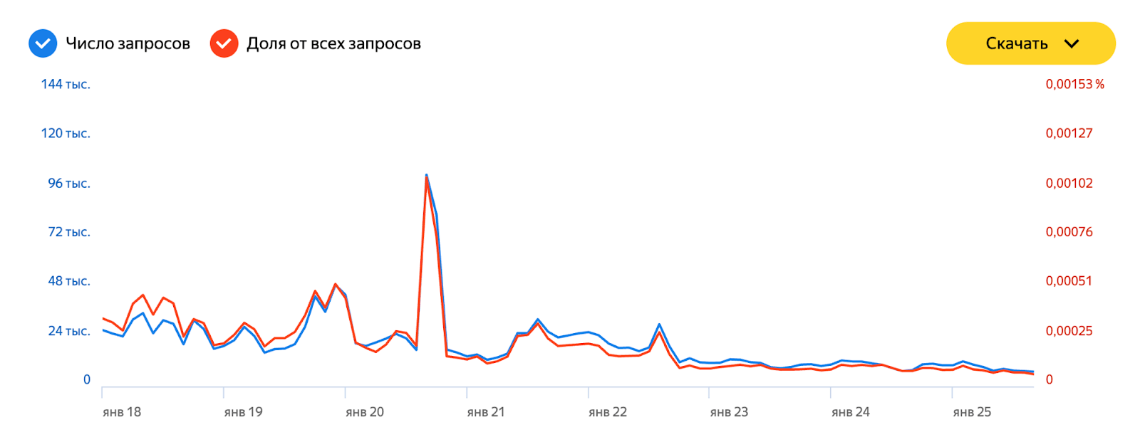 2. Если посмотреть частотность у самых востребованных коммерческих запросов, можно увидеть аномальные всплески спроса. Если слишком высокий спрос не связан с сезонностью или объяснимым трендом, по анализируемому запросу крутили ПФ. Если есть такие исторические данные, то можно сделать вывод, что в вашей нише кто-то как минимум пробовал «химичить» с ПФ. В целом, в нишах, где активно крутит ПФ, уже тяжело судить о реальной частотности по запросу, потому что какая-то часть запросов генерируется роботами.