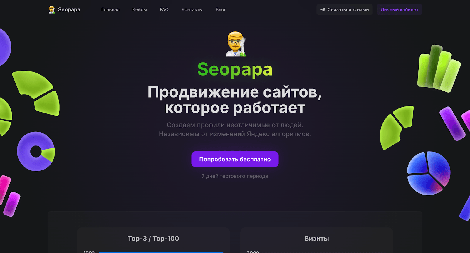 Seopapa позиционирует себя как «уникальный сервис для SEO-продвижения», обещая вывести сайты в топ Яндекса за счет поведенческих факторов. Заявляется имитация поведения реальных пользователей с высокой достоверностью, использование реальных фингерпринтов, собственной прокси-сети и индивидуальных поведенческих скриптов. Сервис также предлагает 7-дневный тестовый период.