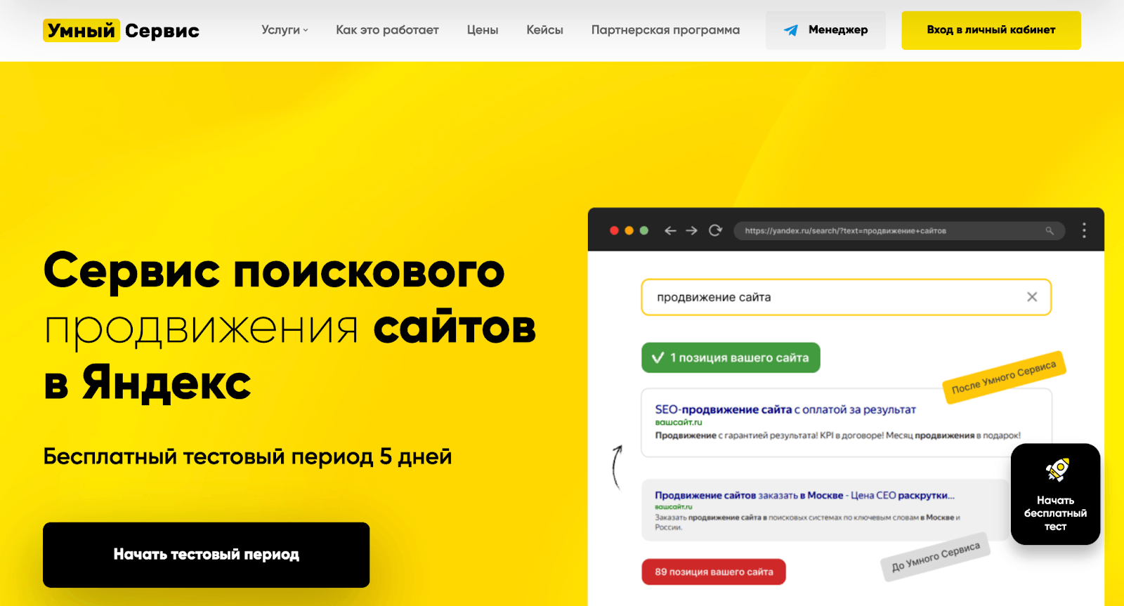 Умный Сервис позиционируется как простое и доступное решение в накрутке поведенческих факторов. Регистрация через Telegram-бота и быстрый запуск кампании (около 10 минут) делают его привлекательным для тех, кто не хочет углубляться в сложные SEO-стратегии. Отличительной особенностью сервиса является максимально упрощенный интерфейс, рассчитанный на пользователей с минимальным бекграундом в SEO. Есть бесплатный тестовый период в 5 дней.