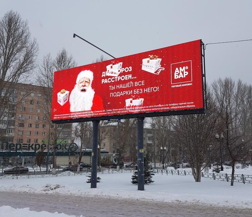 Новогодняя битва брендов в Самаре. На одном цифровом билборде по очереди запустили три ролика, в которых развернулась целая драматическая история с участием Деда Мороза: