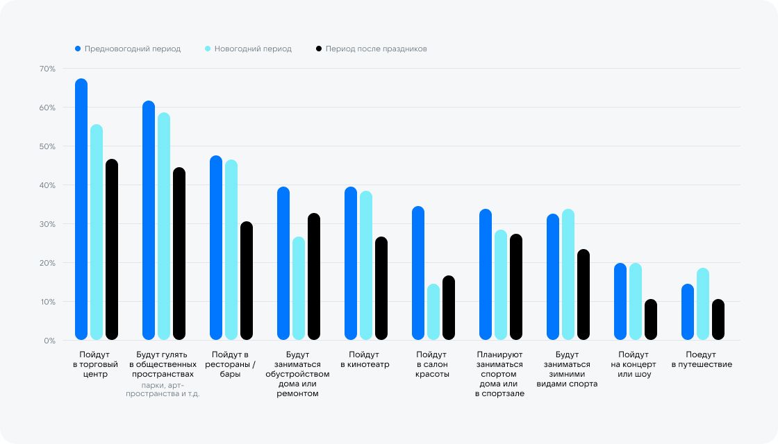Ещё один опрос ВЦИОМ показывает, что в последние годы люди стали чаще выходить из дома в рождественские каникулы. Опрос VK Рекламы это подтверждает: согласно ему, большинство россиян в новогодний период будут гулять в общественных местах или пойдут в торговые центры.
