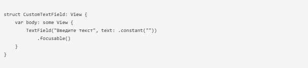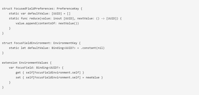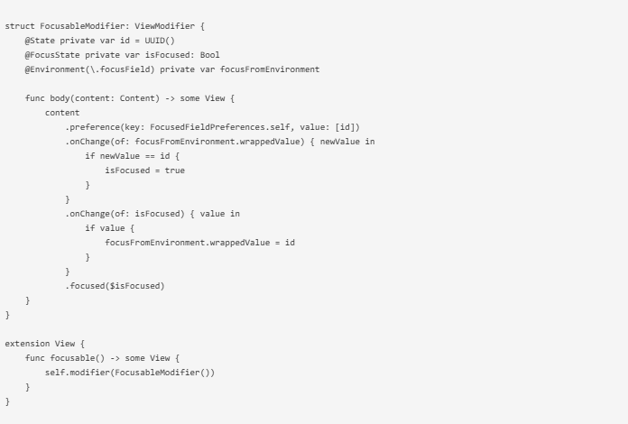 Для управления фокусом у отдельных полей создаётся ViewModifier, который использует @FocusState и связывается с текущим активным UUID через окружение.