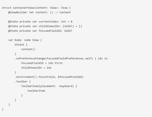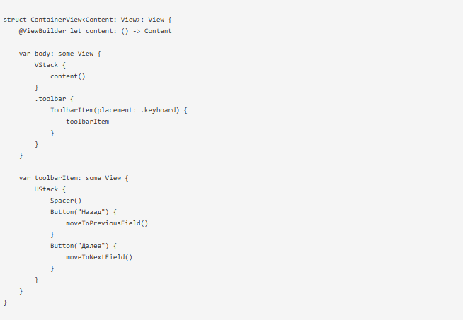 Ниже представлен пример создания UI-компонента с использованием @FocusState и модификатора .toolbar для переключения фокуса между текстовыми полями. Этот подход позволяет переиспользовать код в различных частях приложения, что снижает дублирование, особенно на проектах с множеством форм и анкет.