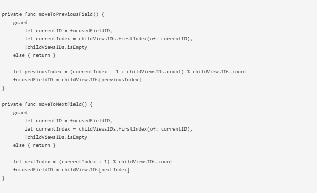 Реализация такого подхода позволяет быстро и удобно переключаться между полями ввода в формах приложений под iOS, повышая удобство взаимодействия пользователя с интерфейсом.