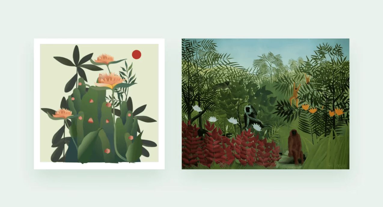 Слева — визуал из брендбука, справа — картина Руссо, которой вдохновлялись дизайнеры
