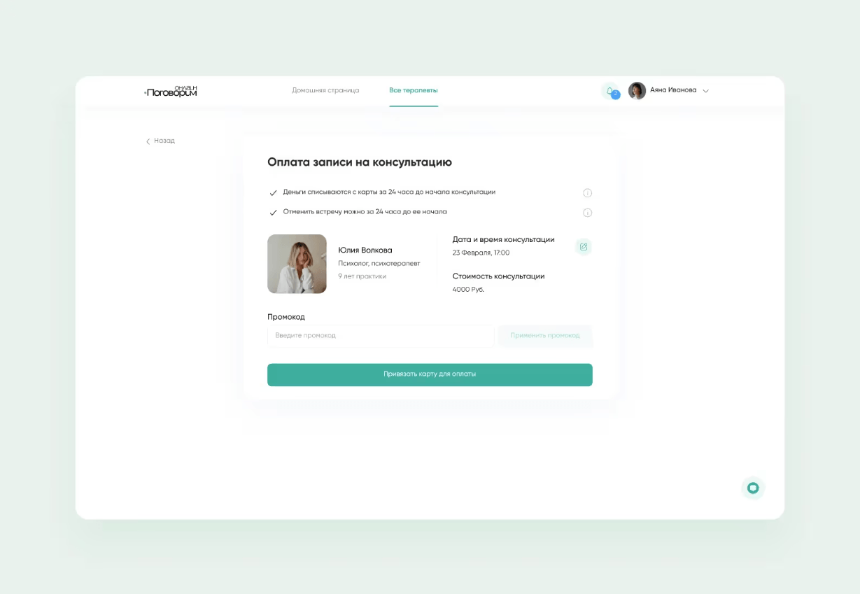 К примеру, чтобы пользователи платформы «Поговорим.онлайн» быстро разобрались в сервисе и могли быстро записаться к специалисту буквально за один шаг, мы в Purrweb максимально упростили интерфейс. Для этого придерживались правила: «Один экран — одна большая кнопка».