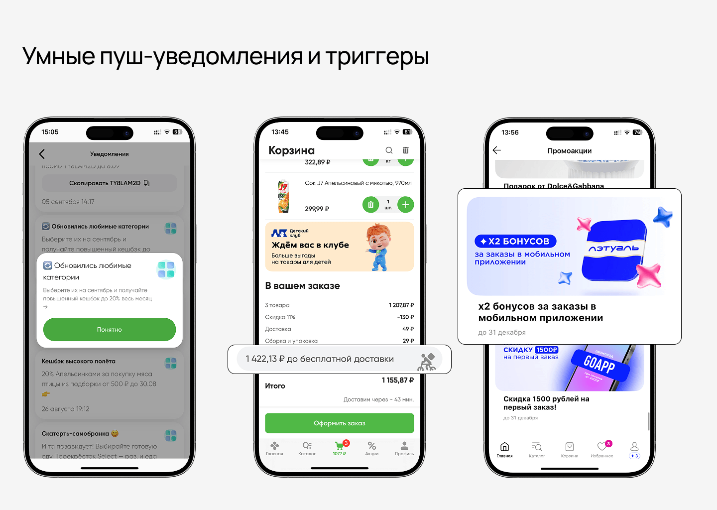 Персонализированные сообщения, которые приложение отправляет пользователю в нужный момент — когда он готов купить или почти принял решение. В отличие от массовых рассылок, такие уведомления строятся на основе действий клиента (триггеры) и данных о его поведении.