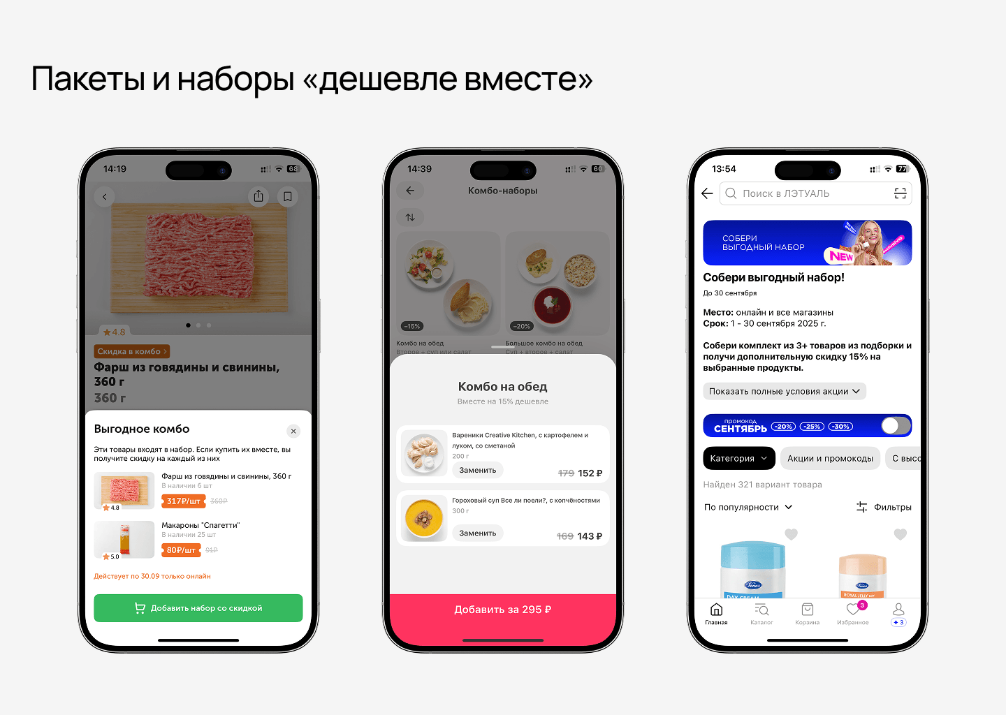 Предлагайте пользователю купить несколько товаров в одном комплекте по более выгодной цене, чем при покупке по отдельности. Это классический инструмент увеличения среднего чека, который отлично работает в мобильных приложениях ритейла, особенно если он подаётся красиво и с персонализацией.