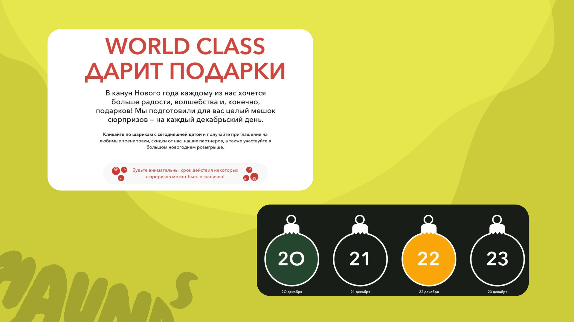 Элегантное решение — адвент-календарь на сайт. Каждый день планируйте новый мини-бонус: массаж, диагностика, гостевой визит. По факту можете раздавать их и в обычное время, но здесь срабатывает фактор ожидания, появляется возможность выкатывать новые креативы вроде «Зайди и получи новый подарок!»