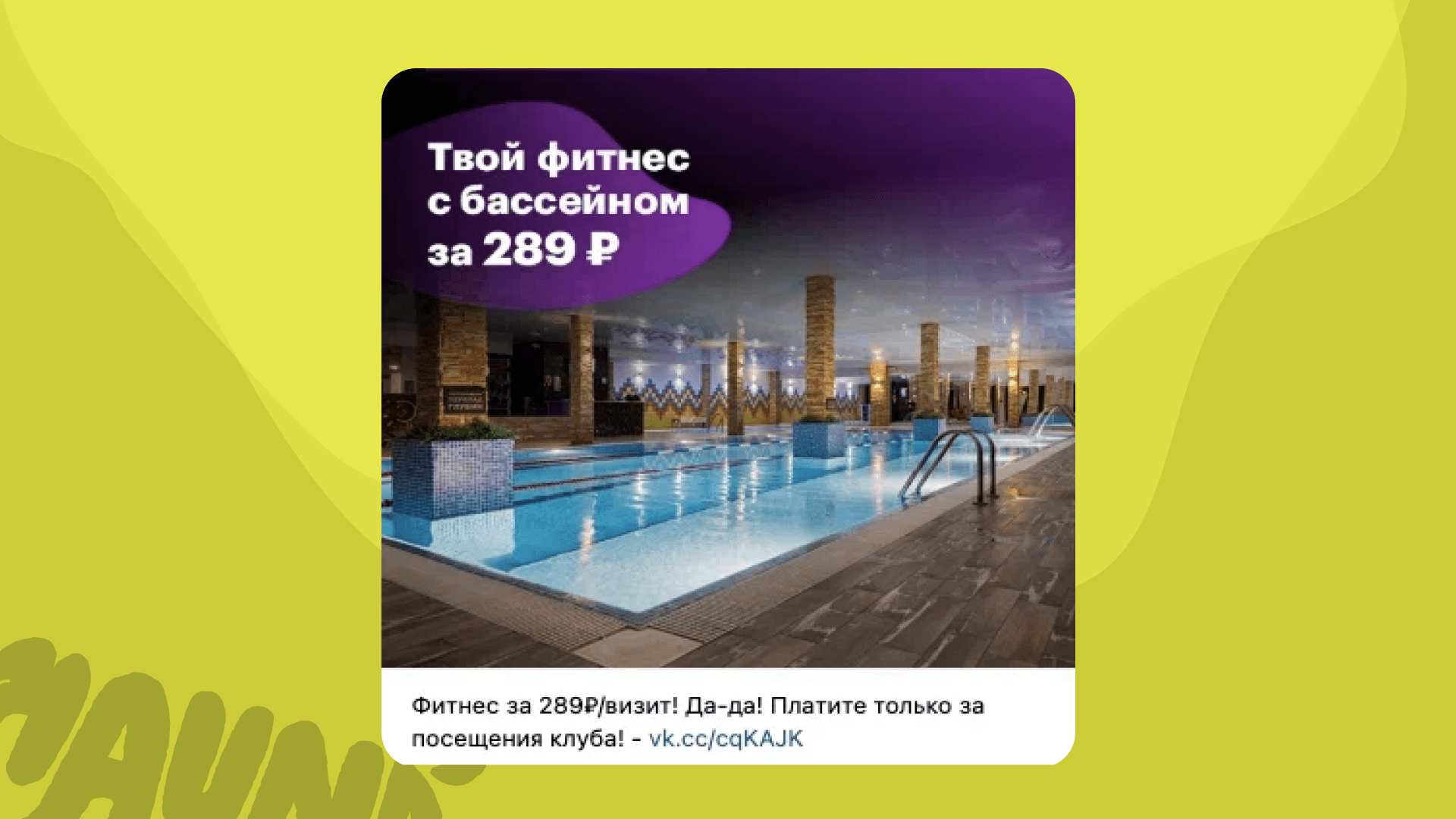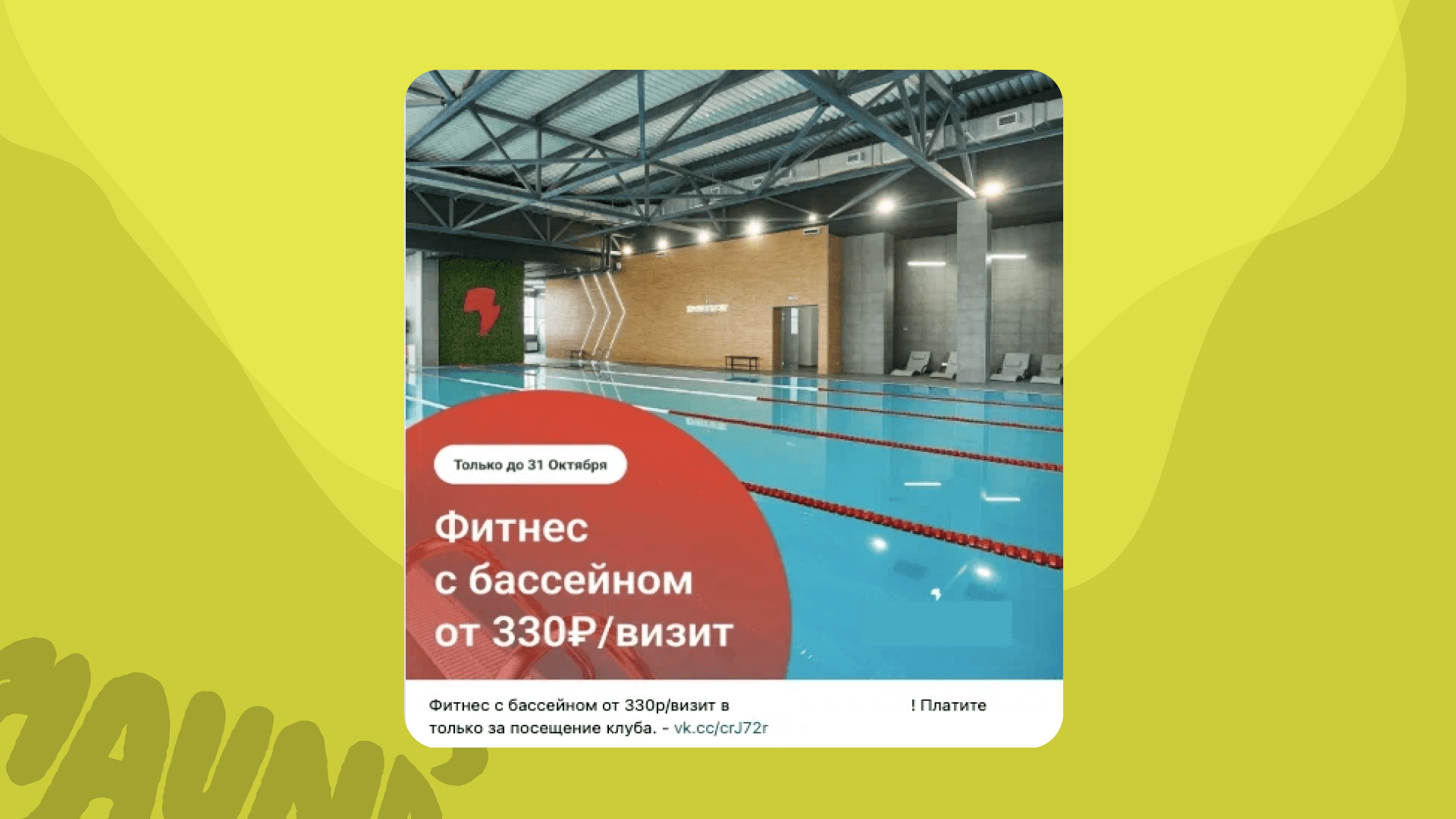 Еще один пример — «Бассейн + фитнес 330 ₽ за визит». Итог аналогичен: высокий спрос и быстрая конверсия.