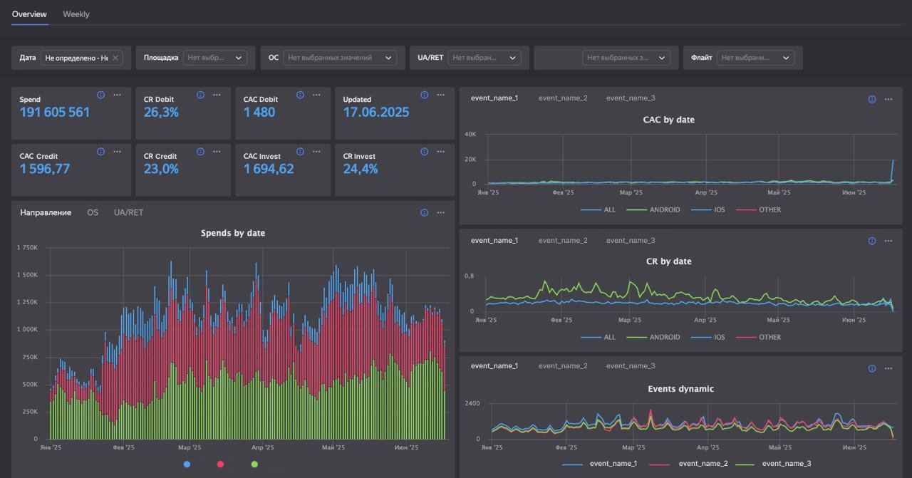 Не все маркетологи работают с таблицами. Часто нужна визуальная картина, особенно при работе с динамикой или сравнением метрик. Наглядный дашборд позволяет за секунды увидеть, что именно требует внимания: где вырос CPI, какая аудитория не конвертируется, какой источник даёт лучший retention.