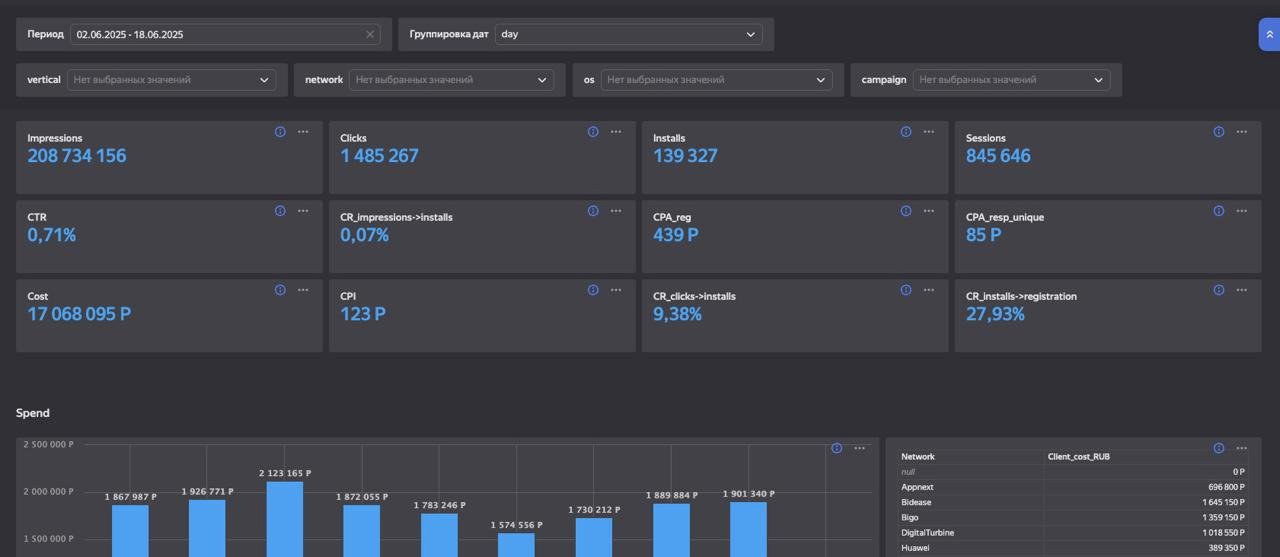 Мы строим аналитику вокруг потребностей клиента: в нужном формате, на нужном языке, с нужной глубиной. Где-то это будет дашборд с открутом по кампаниям, где-то — выгрузка в Google Sheets, а где-то — автоматический алерт с фродовыми источниками. В первую очередь это зависит от задач и потребностей клиента. Не нужно внедрять все и сразу — инструменты могут не только не помочь, но и помешать, если использовать их без потребностей.