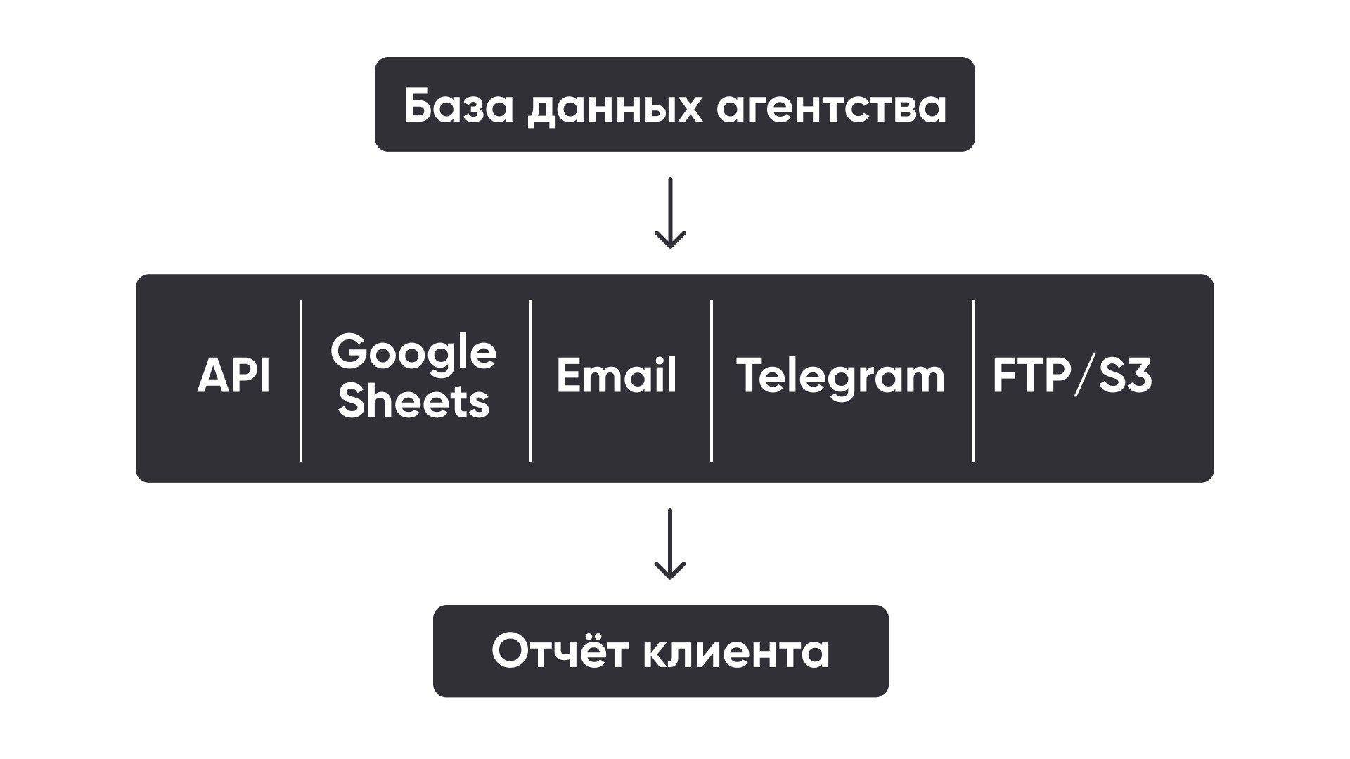 Чтобы этого избежать, мы настраиваем гибкую систему передачи данных, которая точно подстраивается под рабочие процессы клиента. На старте подключаемся к инфраструктуре и смотрим, какие форматы и каналы будут удобны. Вариантов несколько: