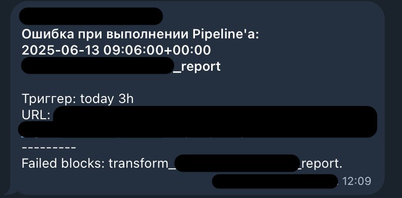 О сбоях. Если данные из трекеров или рекламных платформ не загрузились в хранилище, не рассчитались витрины или отчёты — бот сообщает об этом аналитической команде. Это позволяет моментально реагировать на технические проблемы и минимизировать риск «пустых» данных в отчётах.
